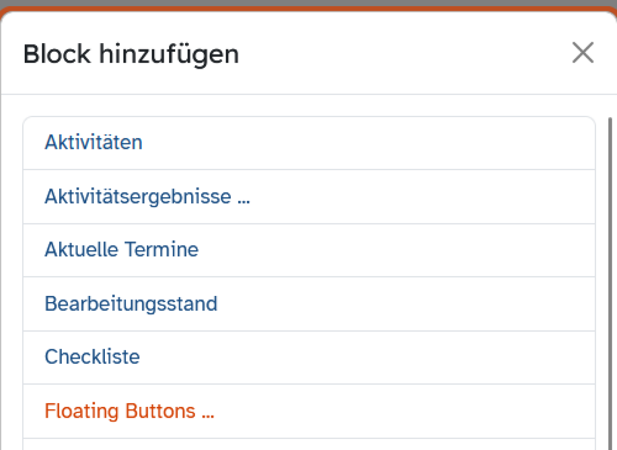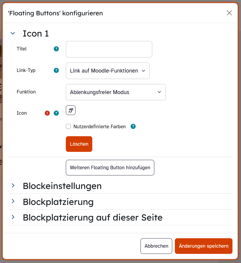 Soll der Floating-Button nicht nur auf den Hauptseiten des Kurses, sondern auch auf Unterseiten sowie bei Aktivitäten erscheinen, bietet es sich an, dies unter der Überschrift Blockplatzierung zu aktivieren. Wählen Sie hier in dem Drop-down-Menü Auf diesen Seiten anzeigen wahlweise Jede Seite, Jede Kursseite oder Jede Kurshauptseite.
