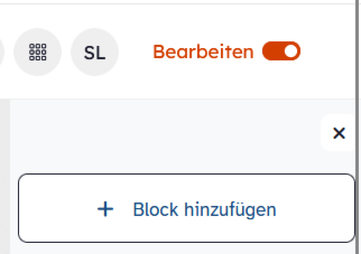 Wechseln Sie in Ihrem Kurs in den Bearbeitungsmodus, indem Sie den Schieberegler in der Topbar neben Bearbeiten aktivieren. Klicken Sie nun auf das Pfeil-Symbol am Rand des Browserfensters, um die Blockleiste zu öffnen. Wählen Sie den Button + Block hinzufügen.