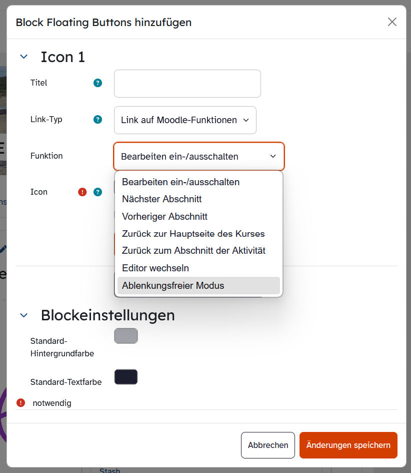 Wählen Sie dann im Drop-down-Menü Link-Typ die Option Link auf Moodle-Funktionen aus und klicken Sie unter Funktion auf Ablenkungsfreier Modus.