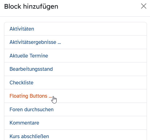 Hier regeln Sie die weitere Darstellung der Floating Buttons in Ihrem Kurs. Klicken Sie hierfür jeweils auf das Pfeil-Symbol bei Blockplatzierung und Blockplatzierung auf dieser Seite.