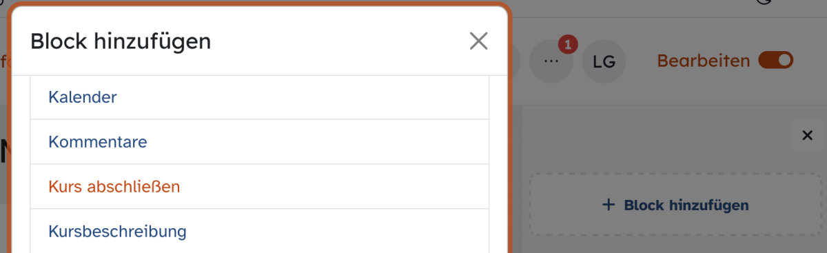 Klicken Sie auf den Button + Block hinzufügen, um das Auswahlmenü der noch verfügbaren Blöcke zu öffnen. Wählen Sie den Block Kurs abschließen durch einen Mausklick aus und fügen Sie ihn somit Ihrer Blockleiste hinzu.
