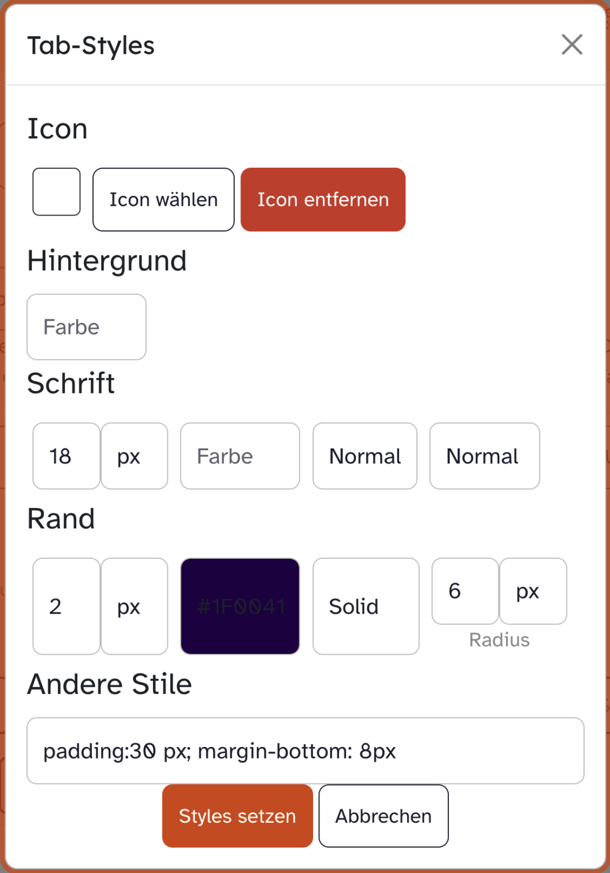 Bei Andere Stile nehmen Sie zusätzliche Veränderungen über CSS-Code am Tab vor, wie z. B. Abstände zwischen den Tabs oder Abstände zwischen dem Tab-Rand und der Tab-Beschriftung.