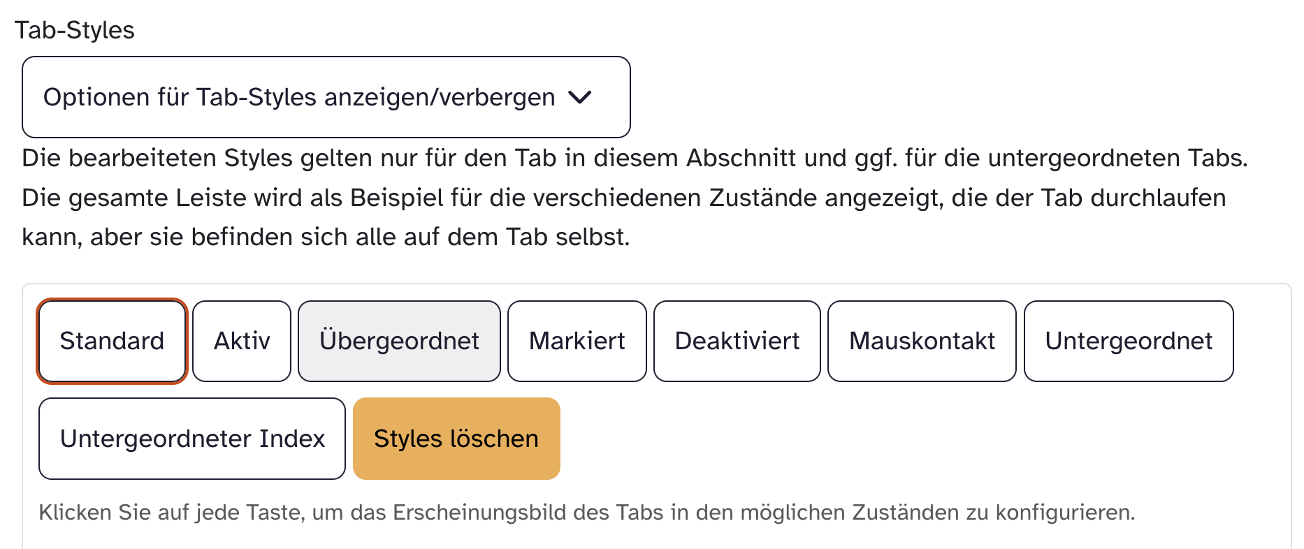 - Untergeordnet: Bei Tabs mit untergeordneter Ebene, wird die Darstellung für die untergeordneten Tabs übernommen.