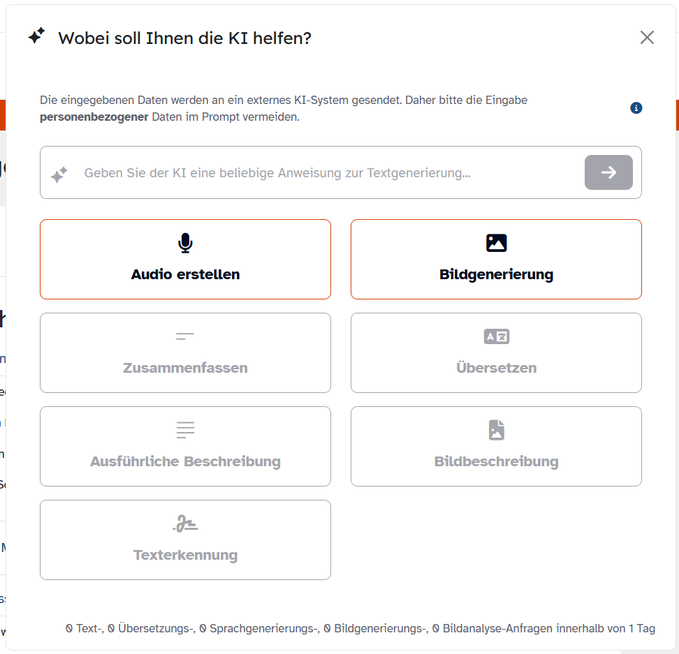 Über einen erneuten Klick auf das KI-Symbol neben der Eingabezeile erreichen Sie bzw. Ihre Schülerinnen und Schüler die weiteren KI-Funktionen.
