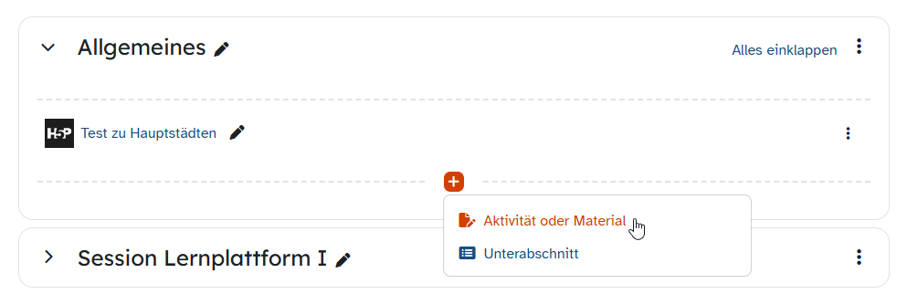 Begeben Sie sich in Ihrem Kurs an die gewünschte Stelle, an der Sie den GeoGebra Rechner erstellen wollen und klicken Sie dort auf das Plus-Zeichen. Wählen Sie im erscheinenden Fenster Aktivität oder Material.