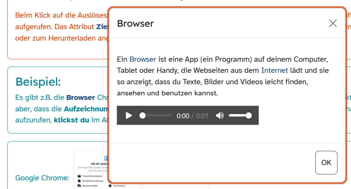 An jeder Stelle des Kursraums, in dem der im Glossar beschriebene Begriff erwähnt wird, erhalten die Lernenden damit Zugriff auf das Glossar in Form einer Einblendung, die über einen Klick auf das Wort aktiviert wird.