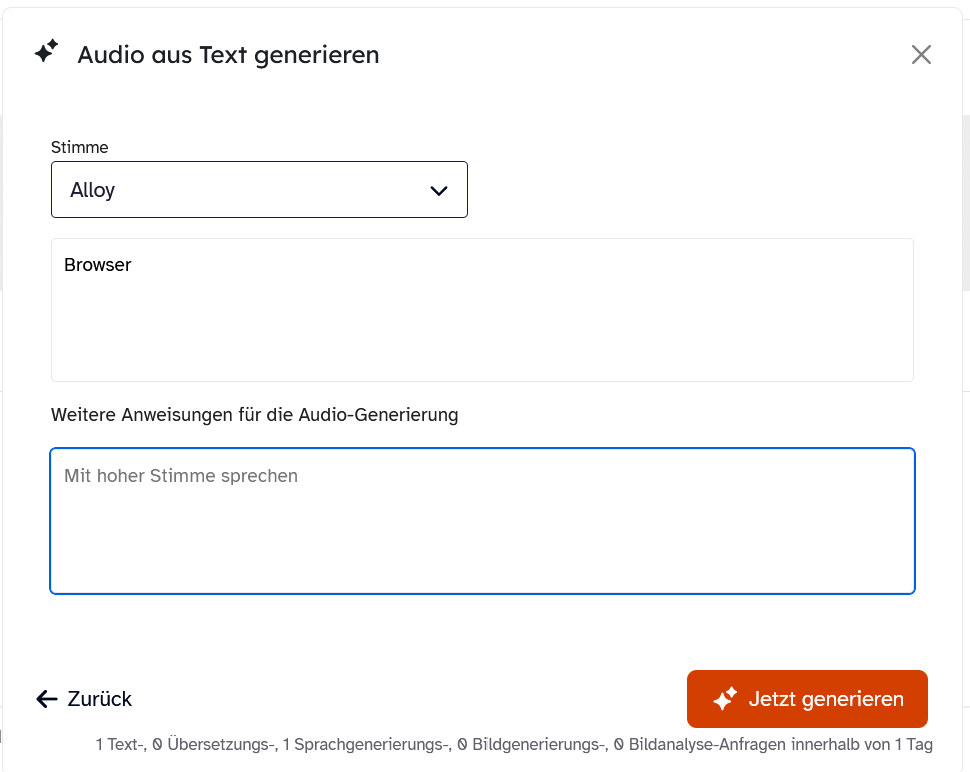 Wählen Sie dazu aus den KI-Funktionen den Eintrag Audio erstellen. Geben Sie den Begriff oder die Erklärung in das Textfeld und ggf. weitere Anweisungen ein und starten Sie die Erstellung des Audios aus Text über Jetzt generieren.