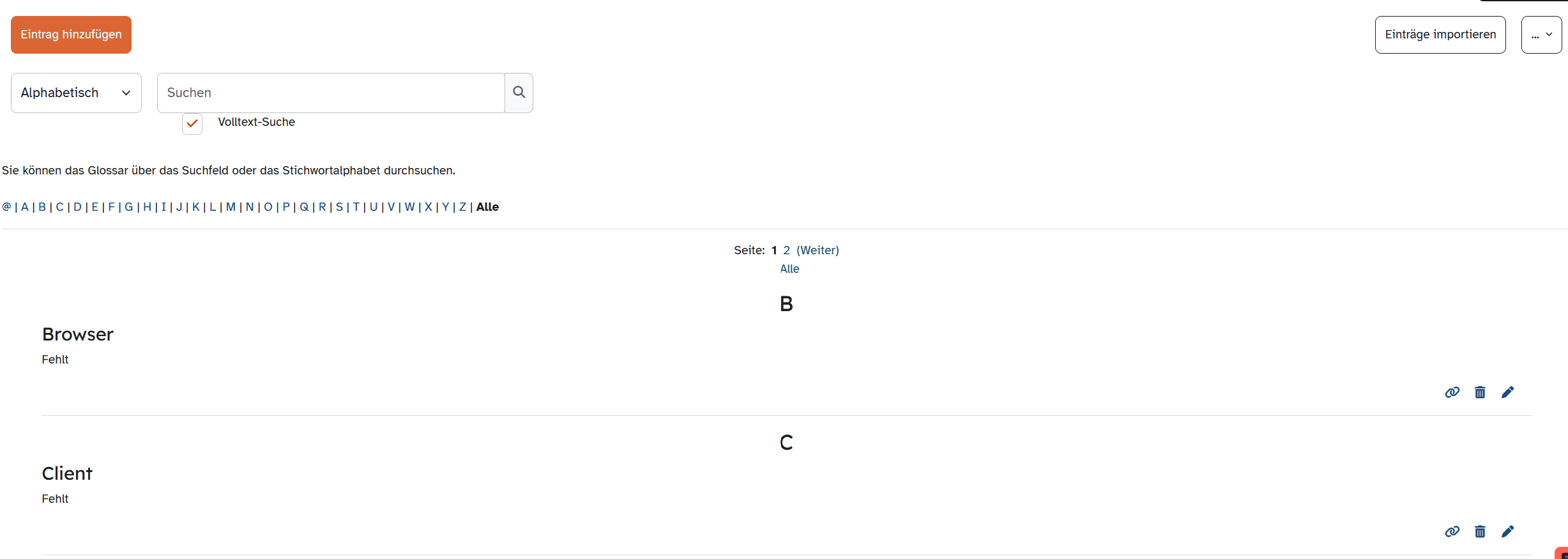 Wählen Sie Eintrag hinzufügen, um einen Beitrag zu erstellen. Vorhandene Begriffe werden mit einem Klick auf das Stift-Symbol bearbeitet.