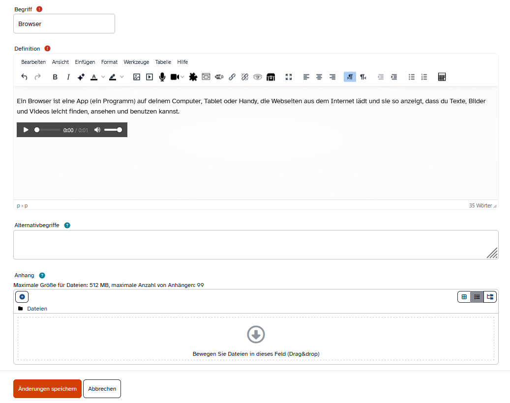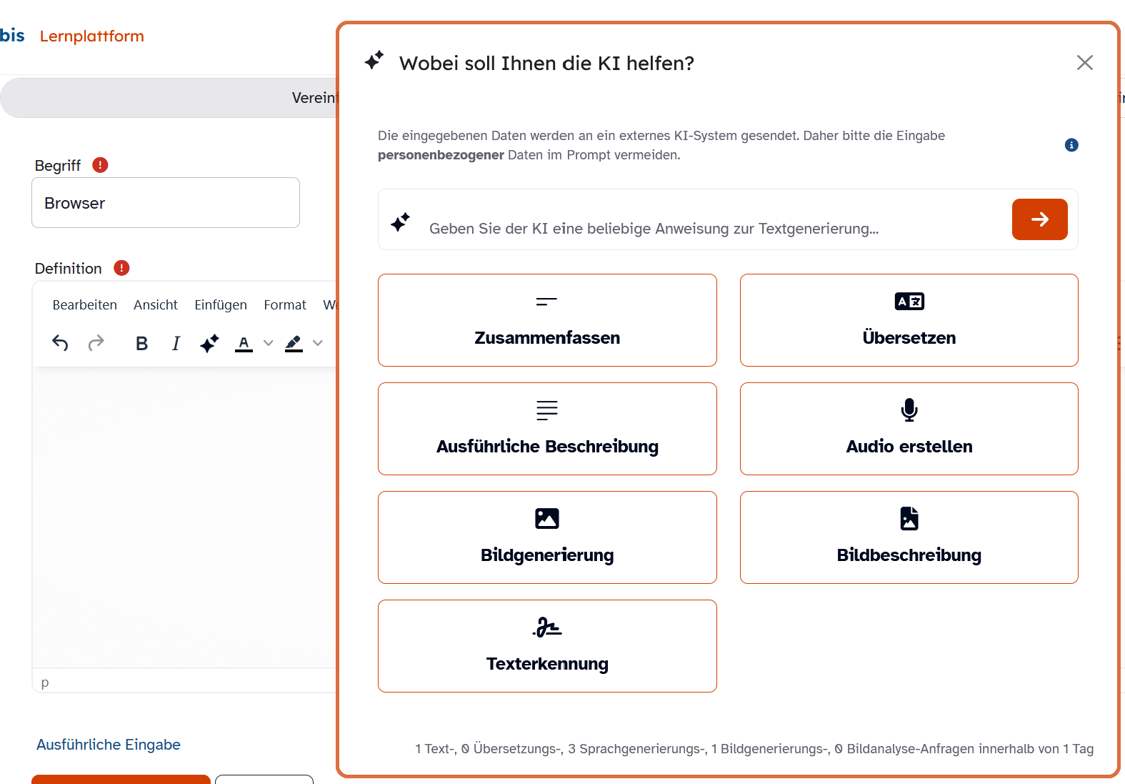 Einträge für ein Glossar zu erstellen, kann sehr zeitaufwändig sein. Erfahren Sie hier, wie Sie die KI-Funktionen der Lernplattform im Glossar nutzen, um sehr einfach Erklärungen, Bilder und Audioausgaben etc. einzufügen.