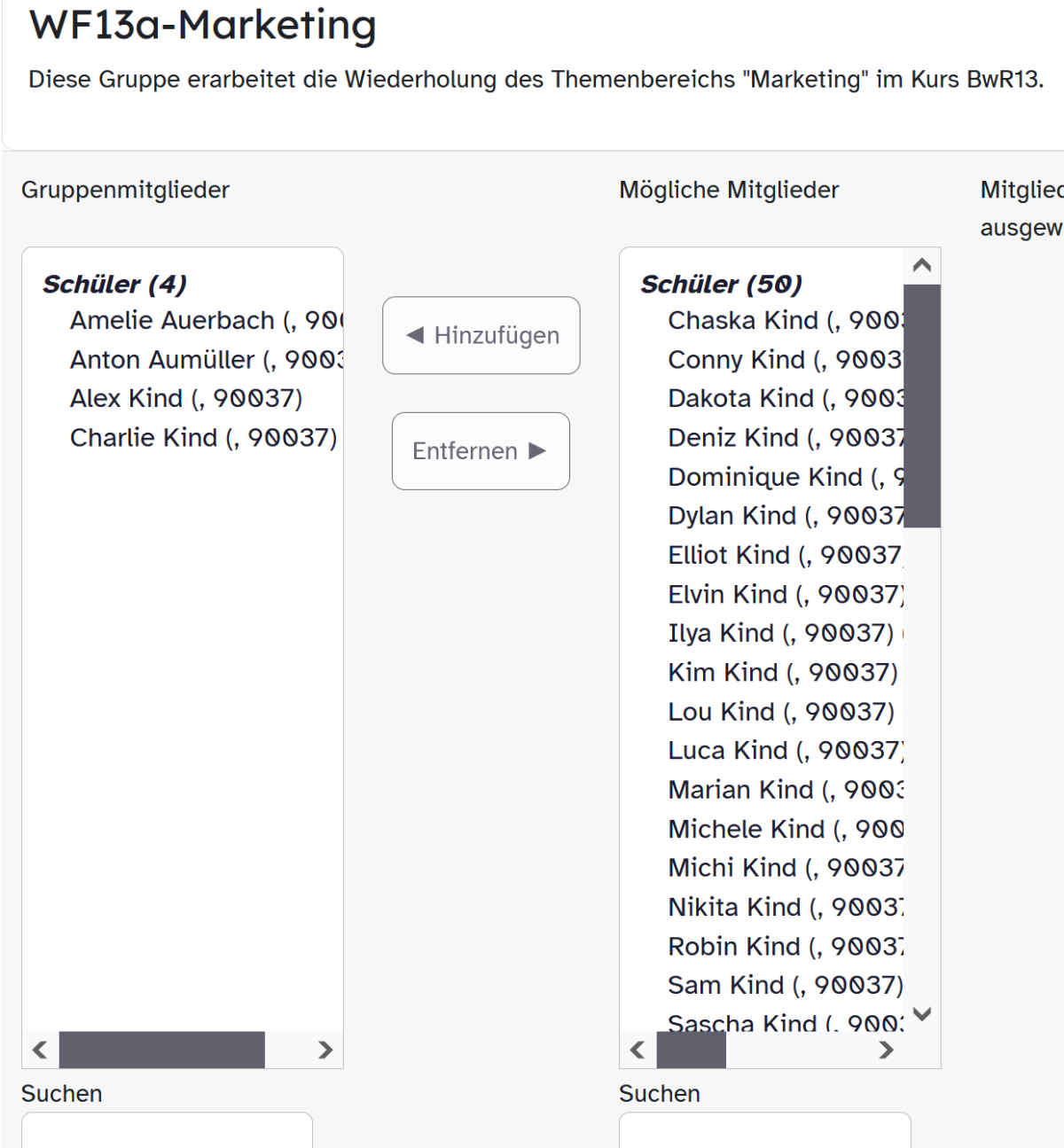 Klicken Sie auf Nutzer/innen verwalten, um Ihrer Gruppe Teilnehmende manuell hinzuzufügen oder einzelne Teilnehmende später wieder aus der Gruppe zu entfernen. Klicken Sie hierzu unter Mögliche Mitglieder im Drop-down-Menü auf das Pfeil-Symbol und setzen Sie neben den entsprechenden Namen einen Haken. Klicken Sie anschließend auf OK.