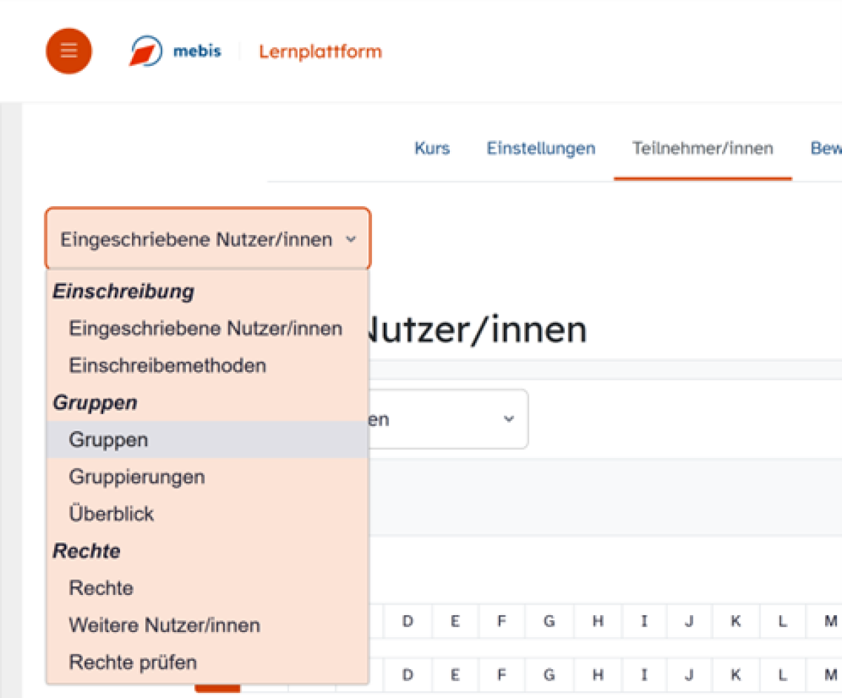 In der sekundären Navigationsleiste wählen Sie den Reiter Teilnehmer/innen aus und wählen anschließend im Drop-down-Menü Eingeschriebene Nutzer/innen den Menüpunkt Gruppen.