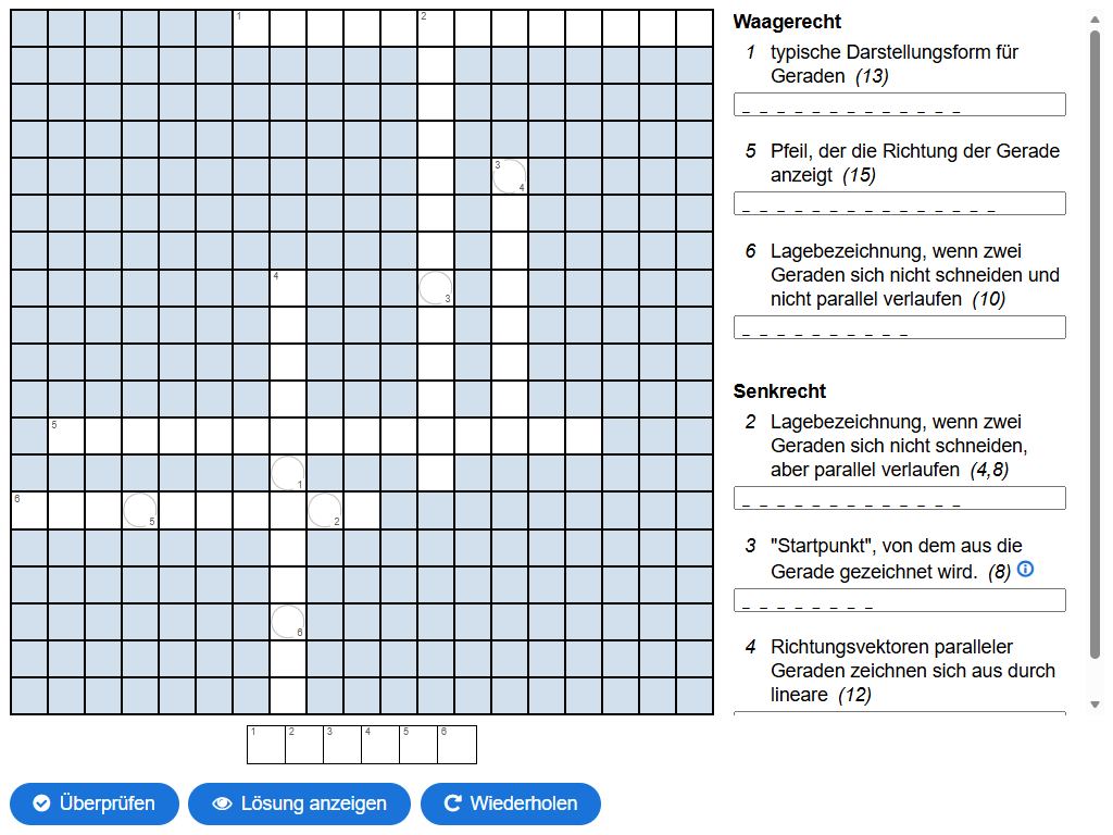 Wenn deine Lehrkraft die entsprechende Einstellung vorgenommen hat, gibt es einzelne Zellen im Gitter, die mit einem Kreis und einer Ziffer markiert sind. Diese benötigst du, um das Lösungswort unterhalb des Kreuzworträtsel zu ermitteln.