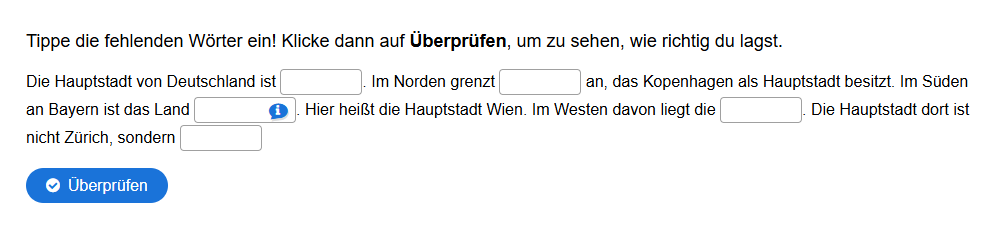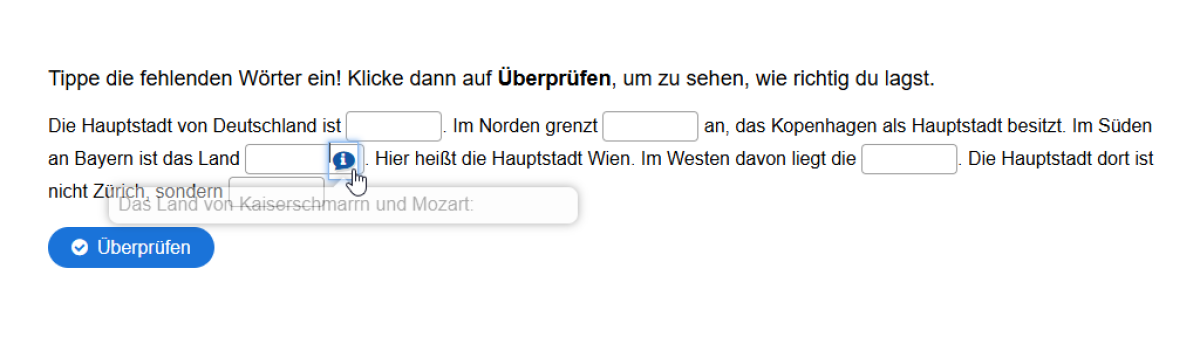 Manche Lücken haben ein blaues i-Symbol an der Seite. Hier hat deine Lehrkraft einen Tipp hinterlegt, der dir beim Finden der Lösung hilft.