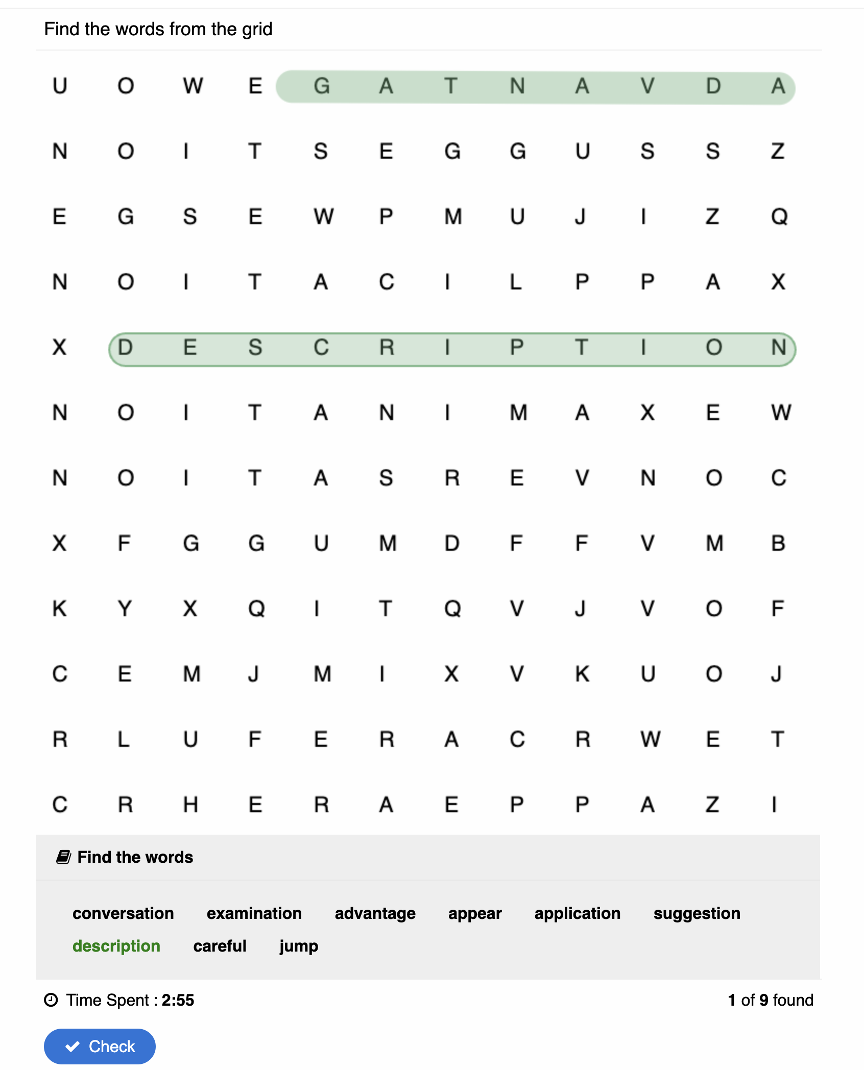 Wenn du richtig liegst, wird das Wort übernommen bzw. als gefunden markiert.