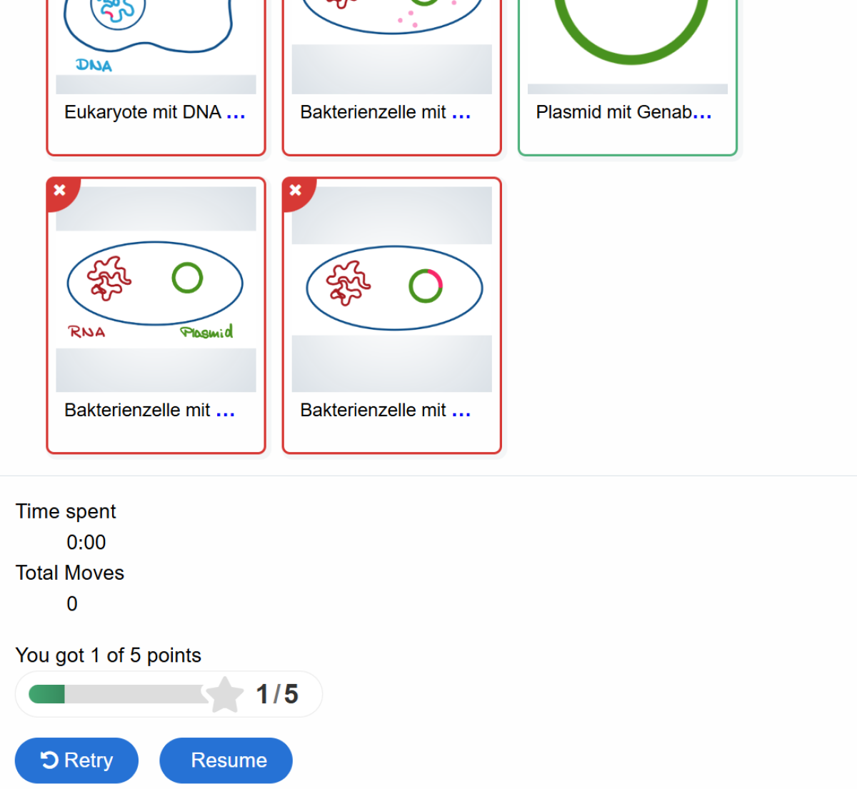 Wenn deine Lehrkraft die entsprechenden Einstellungen aktiviert hat, kannst du die Übung mit einem Klick auf Retry neu starten oder mit Resume an deiner letzten Bearbeitungsstelle weitermachen.