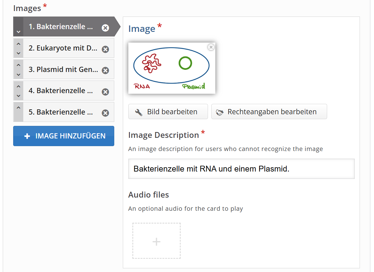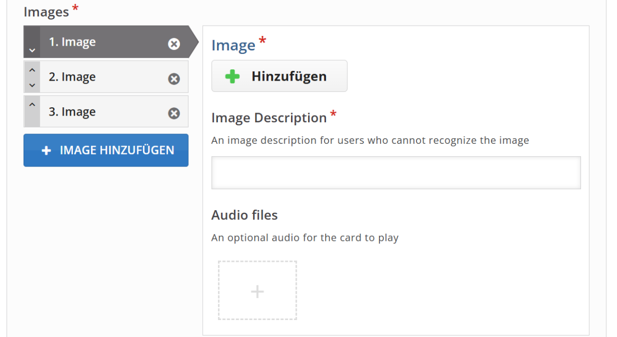 Mit einem Klick auf das Plus-Symbol im Bereich Audio files können Sie das Bild optional um eine Audio-Datei ergänzen. Laden Sie diese entweder aus Ihren persönlichen Dateien hoch oder geben sie die URL zur Datei im Internet an. Bestätigen Sie Ihre Auswahl mit Einfügen.