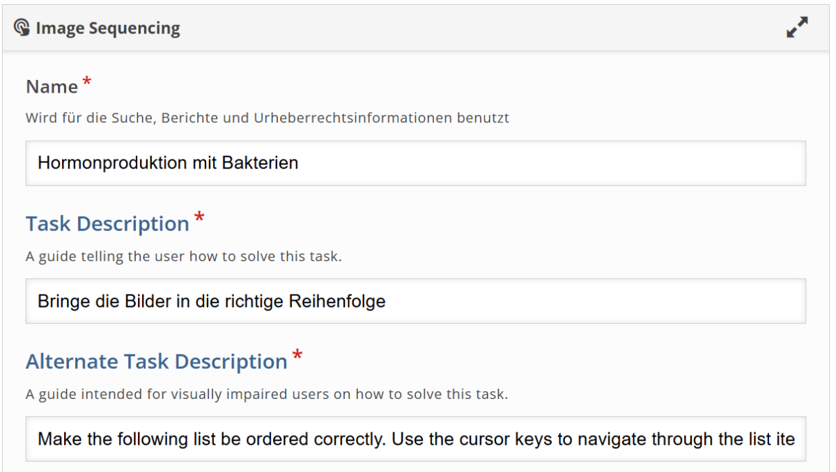 Vergeben Sie in der sich öffnenden Oberfläche für Ihre Aufgabe im Feld Name einen griffigen Titel und hinterlegen Sie für Ihre Klasse im Textfeld Task Description eine entsprechende Aufgabenbeschreibung. Passen Sie außerdem die Beschreibung für Lernende mit Sehbeeinträchtigung im Feld Alternate Task Description an.