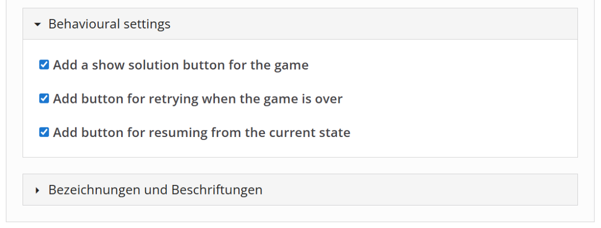 Standardmäßig ist eingestellt, dass Lernende sich die Lösung anzeigen lassen, die Übung wiederholen und an ihrer letzten Position weitermachen können. Durch Deaktivieren der entsprechenden Checkbox entfernen Sie diese Optionen.