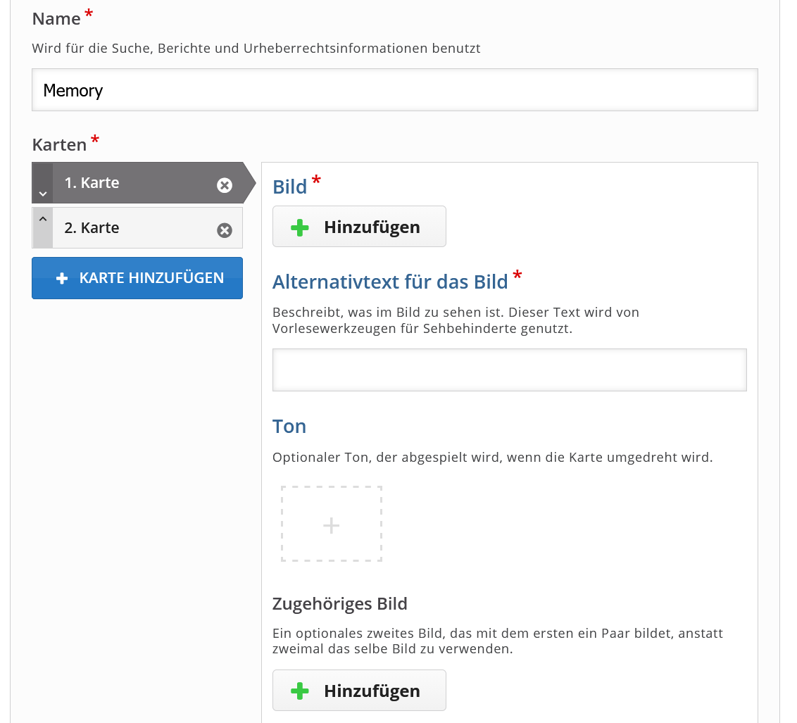 Klicken Sie auf den Button + Hinzufügen, um ein Bild von Ihrem Endgerät hochzuladen. Fügen Sie einen Alternativtext für das Bild ein. Dieser Text erscheint auch in der Kartenauswahl. Optional haben Sie die Möglichkeit, einen Ton einzufügen, welcher zusätzlich abgespielt wird, wenn Sie die Karte umdrehen. Wählen Sie hierzu das +-Symbol an und laden Sie eine Tondatei von Ihrer Festplatte hoch oder nehmen Sie diese über den Reiter Ton-Aufnahme direkt auf.