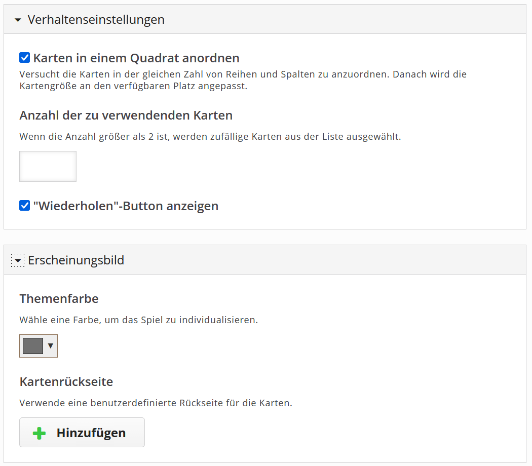 Darüberhinaus ist es möglich, dass nicht alle konfigurierten Karten für das Memory verwendet werden. Legen Sie dies über Anzahl der zu verwendenden Karten fest, indem Sie im dortigen Textfeld eine entsprechende Ziffer festlegen.