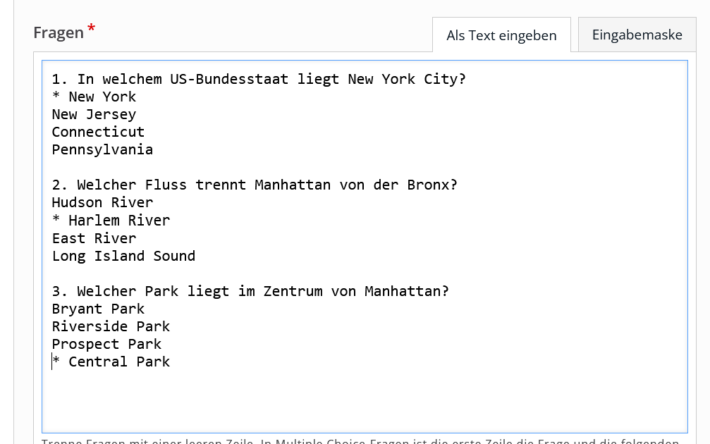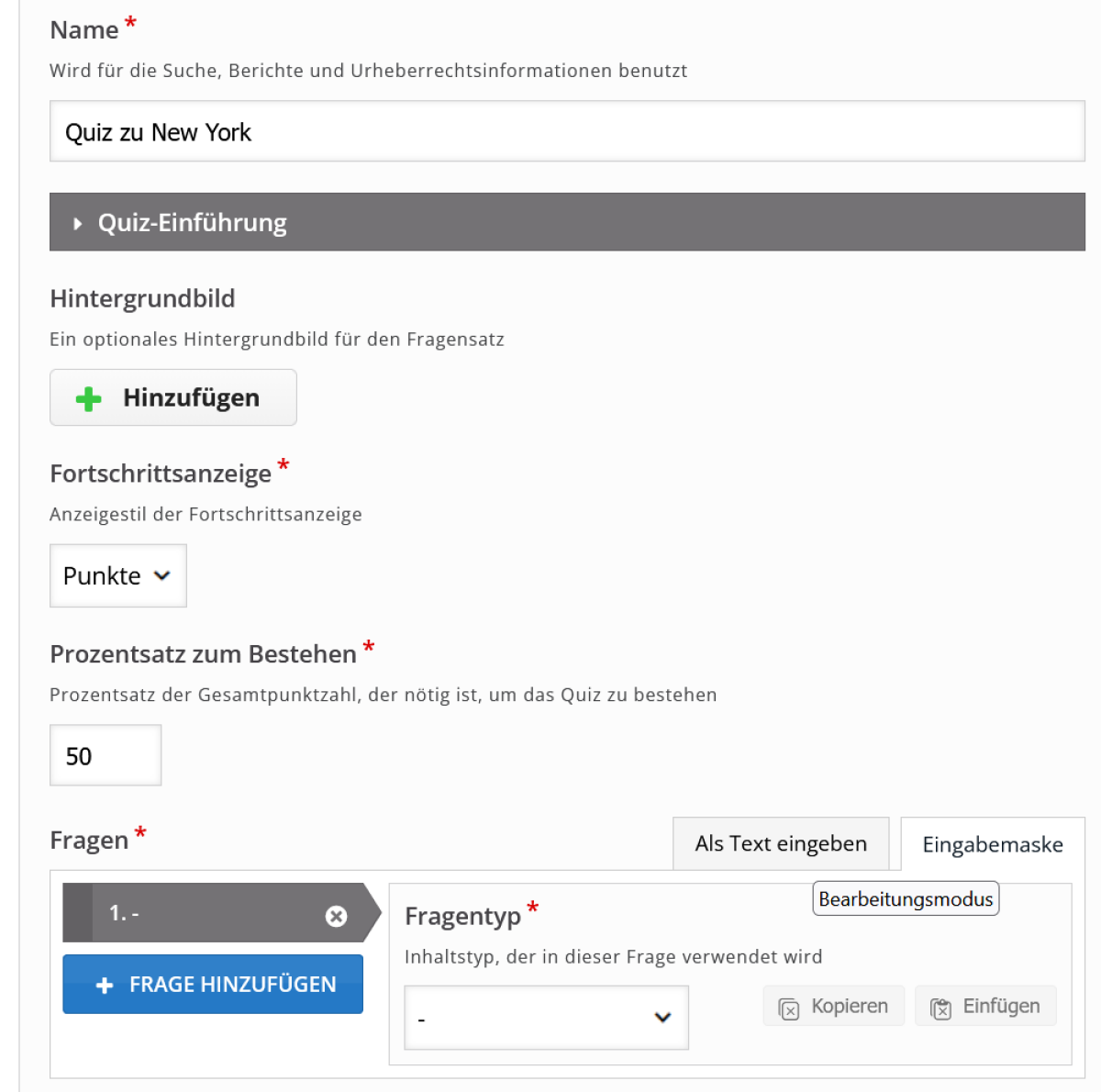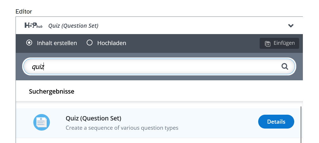 Wählen Sie den Inhaltstyp Quiz (Question Set) aus, in dem Sie z. B. das Suchfeld benutzen oder unter Alle Inhaltstypen hinscrollen. Klicken Sie auf Quiz (Question Set).