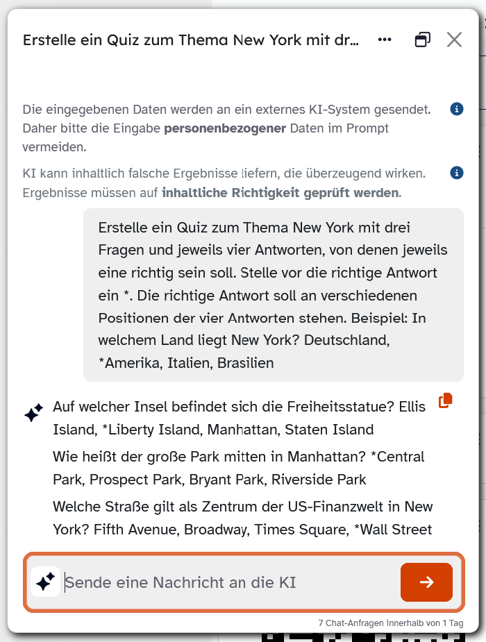 Die Erstellung der Fragen für Ihr Quiz findet im KI-Chat des Kursraums statt. Wenn diese Funktion in Ihrem Kurs bereits aktiviert ist, finden Sie das KI-Symbol auf jeder Seite des Kursraums in der unteren, rechten Bildschirmecke. Dieser KI-Chat ist zunächst nur für Sie verfügbar. Die Lernenden erreichen ihn erst, wenn Sie dies über das KI-Kontrollzentrum einschalten.