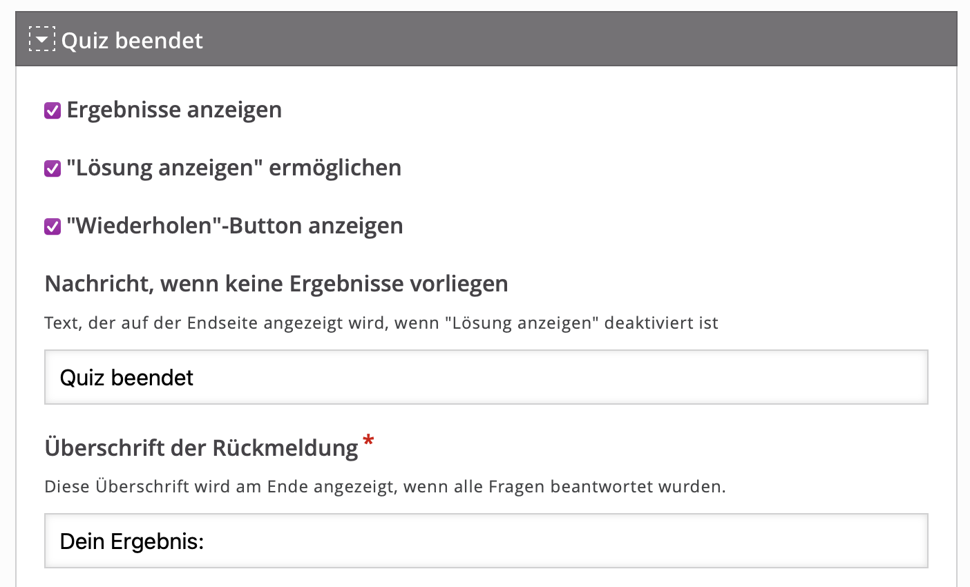 Falls Sie das Quiz nicht als Selbsttest, sondern als Lernstandserhebung bzw. Rückmeldung über den Leistungsstand verwenden, entfernen Sie nach Erstellung aller Fragen unter Quiz beendet die Häkchen bei den drei aufgeführten Optionen Ergebnisanzeige, Lösung anzeigen und Wiederholen. Dadurch erhalten die Lernenden kein sofortiges Feedback und können den Test nicht wiederholen.