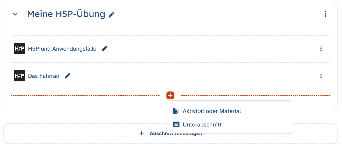 Navigieren Sie dann an die Stelle Ihres Kurses, an der Sie die H5P-Aktivität erstellen möchten.