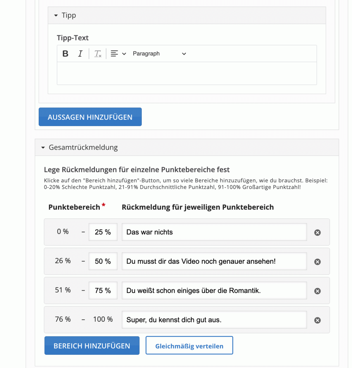 Sie können im Editor auch eine Gesamtrückmeldung basierend auf der Prozentzahl der richtigen Antworten festlegen und Ihren Lernenden so eine Rückmeldung zu ihrem Kenntnisstand geben.