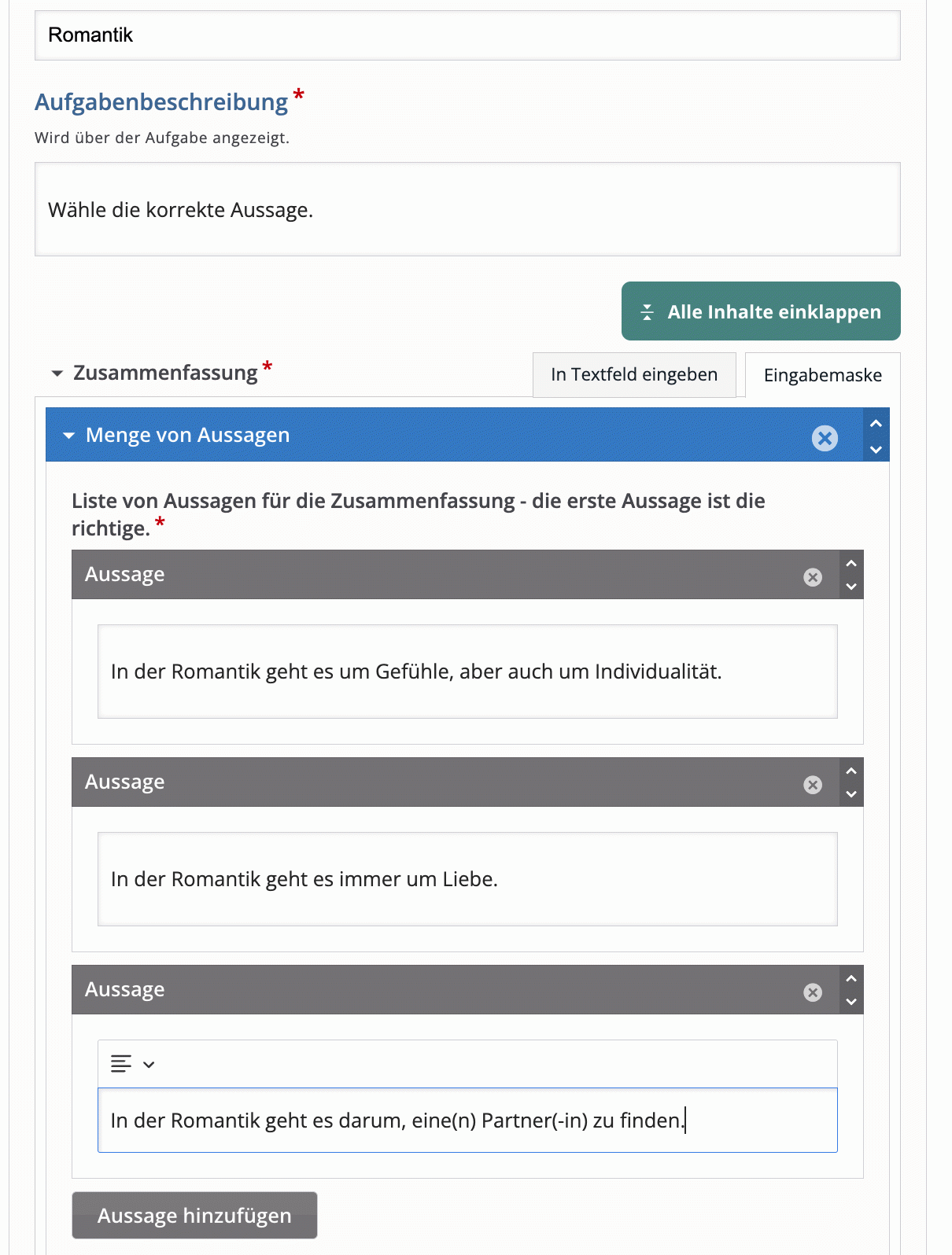 Über den Button Aussage hinzufügen erzeugen Sie weitere Textfelder, um zusätzliche (falsche) Aussagen einzugeben.