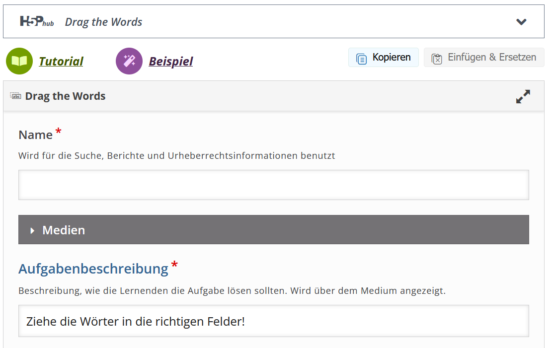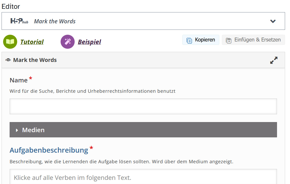 Detaillierte Informationen hierzu finden Sie im Tuturial H5P - Mark the Words mit KI erstellen.