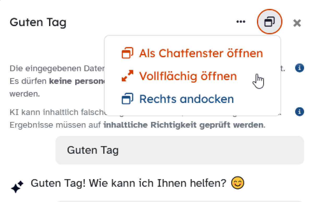 Über das Fenster-Symbol lässt sich die Darstellung des Chats verändern. Klicke auf Vollflächig öffnen, um das Chatfenster im Vollbild zu sehen, oder auf Rechts andocken, um es als eigenen Bildbereich direkt im Browser zu öffnen.