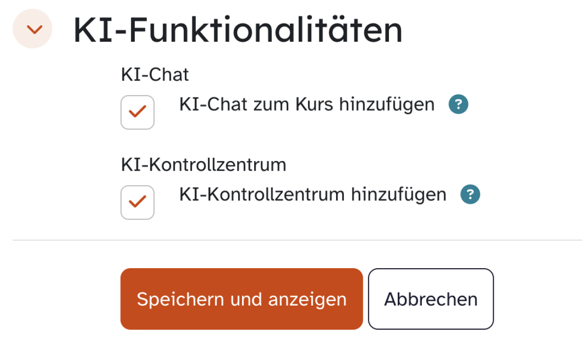 Darüber hinaus haben Sie die Möglichkeit, einen KI-Chat in Ihren Kurs zu integrieren. Setzen Sie hier den Haken bei KI-Chat zum Kurs hinzuzufügen. Um diesen für Ihre Schülerinnen und Schüler freizugeben, ist es nötig, auch das KI-Kontrollzentrum zu aktivieren. Mit Speichern und anzeigen übernehmen Sie Ihre Einstellungen.