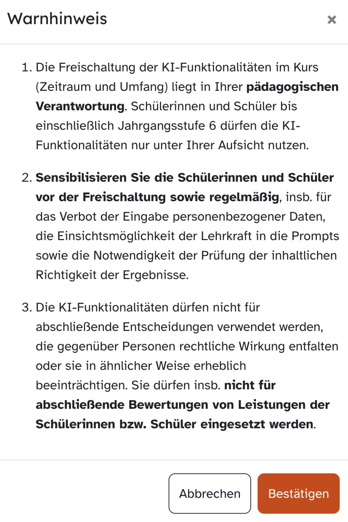Sie haben in Ihrem Kurs die KI-Funktionalitäten aktiviert und möchten nun Funktionen für Ihre Schülerinnen und Schüler freigeben. Erfahren Sie hier, wie Ihnen das in wenigen Schritten gelingt.