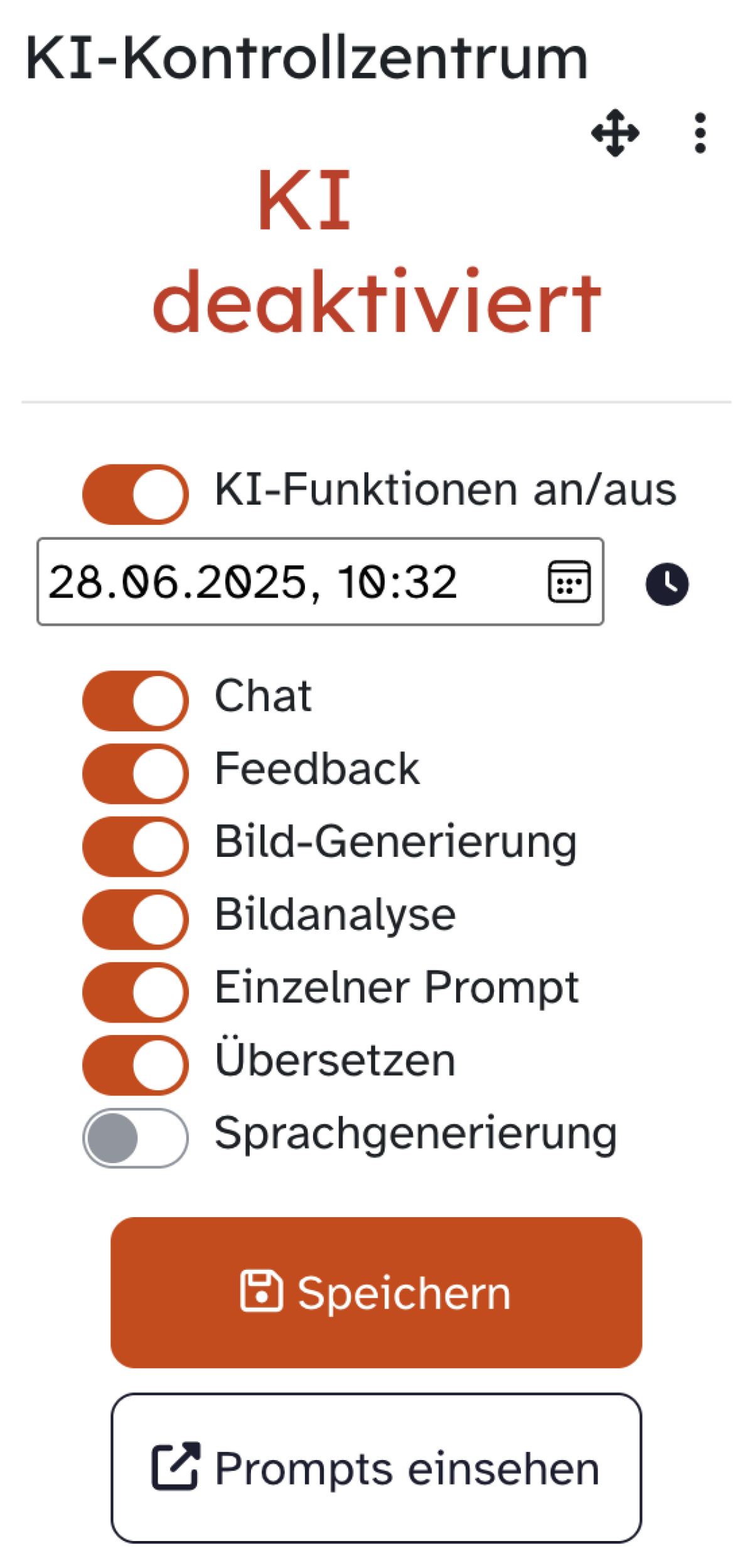 Nun erscheint das KI-Kontrollzentrum. Aktivieren Sie über den Schieberegler bei KI-Funktionen an/aus generell die KI-Funktion für Ihre Lernenden.