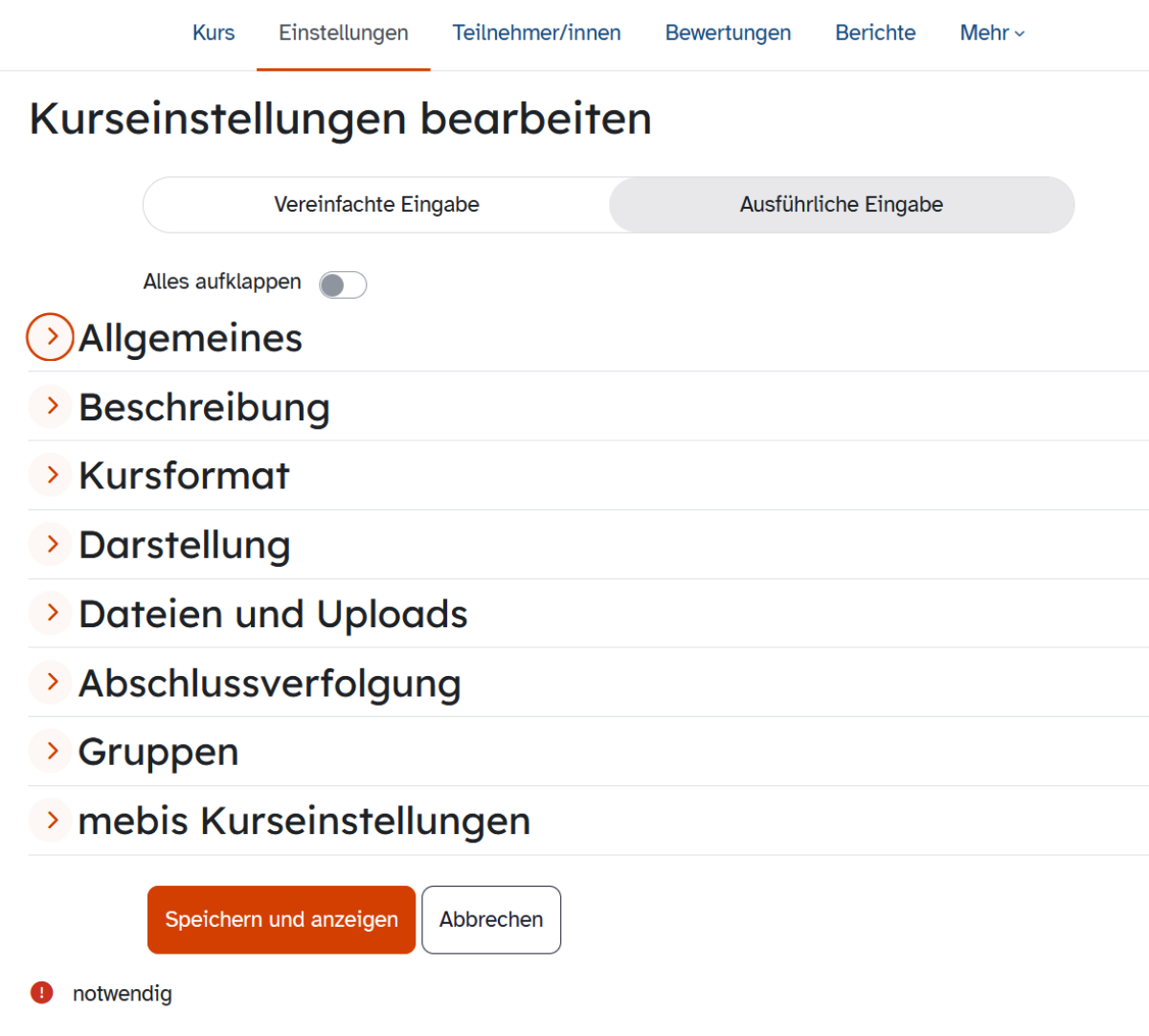 Verändern Sie den Namen sowie den kurzen Kursnamen, legen Sie die Sichtbarkeit fest oder definieren Sie Kursbeginn und -ende.