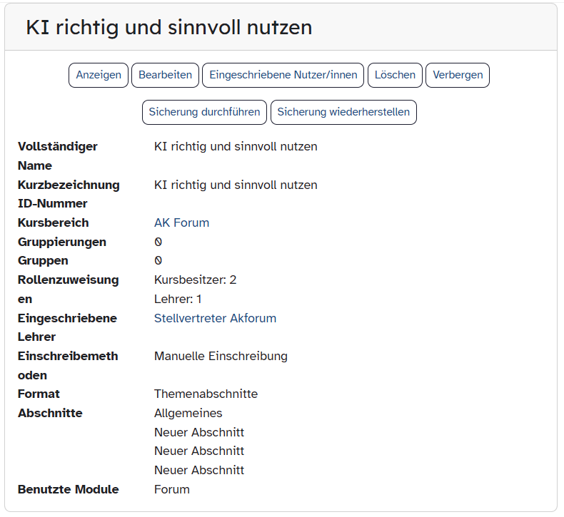 Neben der Auskunft, welche Lehrkräfte in Lehrerrolle in diesem Kurs eingeschrieben sind, erhalten Sie beispielsweise auch Informationen zum Kursnamen.