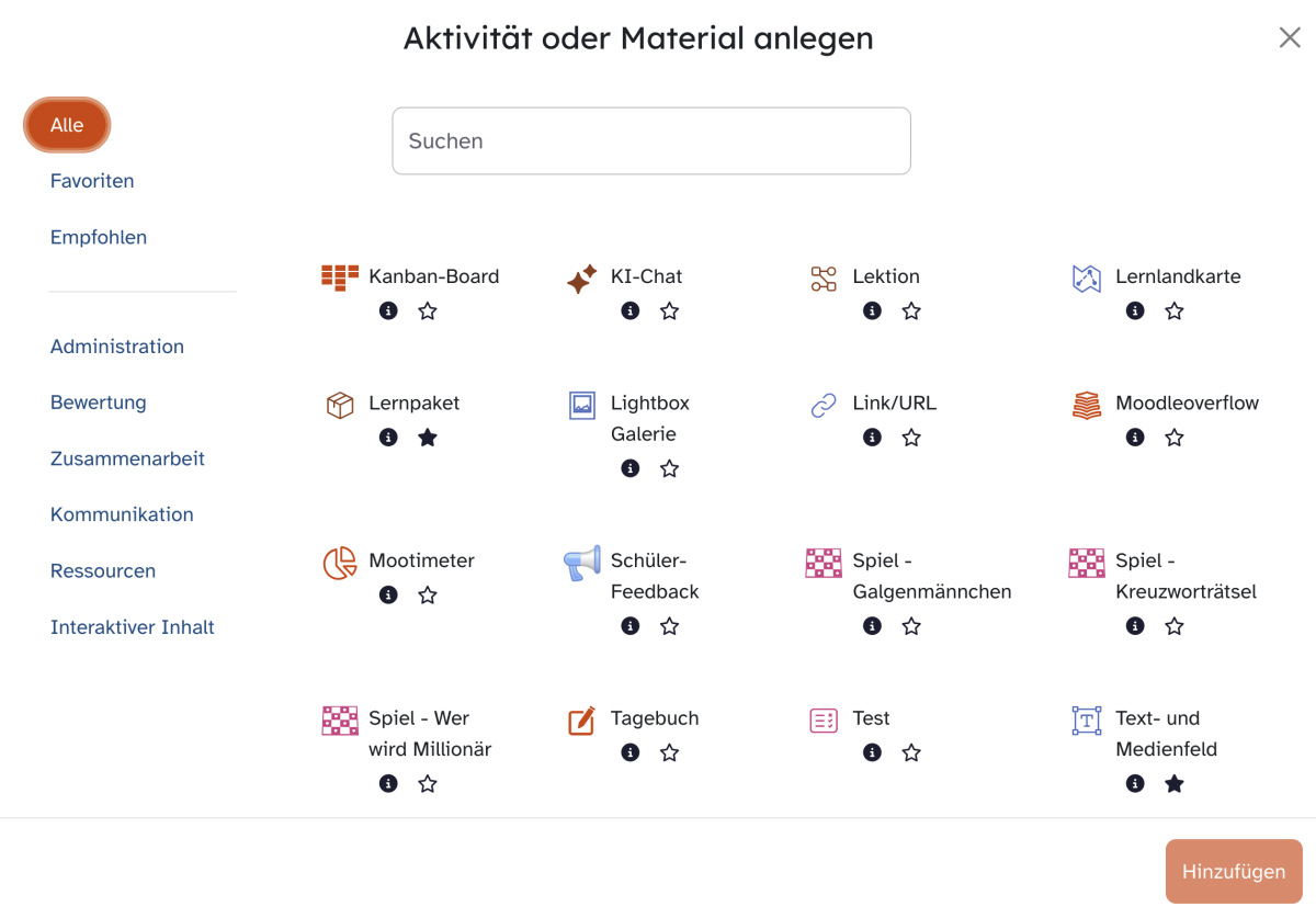 Suchen Sie dort über das Suchfeld oder den passenden Anwendungsbereich die gewünschte Aktivität aus und legen Sie diese entweder über einen Doppelklick oder einen Klick auf Hinzufügen in Ihrem Kurs an.