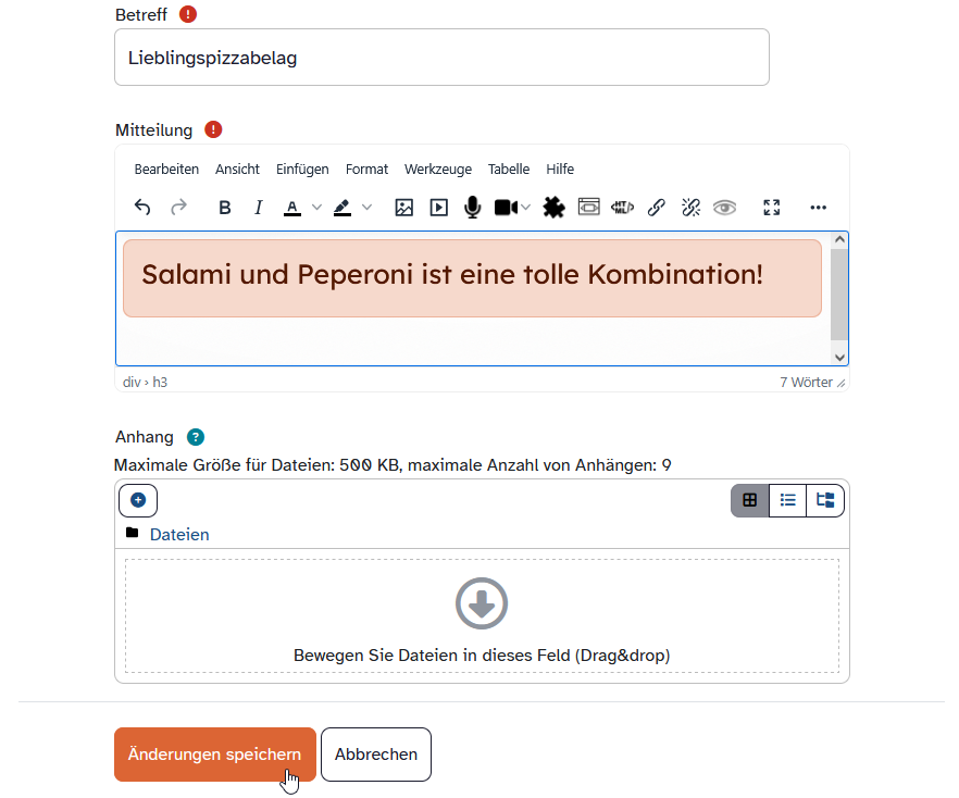 Füge zusätzlich, wenn du möchtest, eine Datei als Anhang hinzu, indem du sie per Drag-and-drop in den gekennzeichneten Bereich ziehst oder über das Plus-Symbol hochlädst.