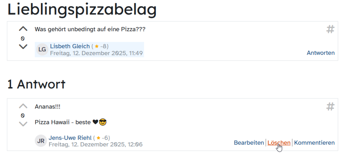 Du siehst nun sämtliche Beiträge, die bislang von allen teilnehmenden Personen im Moodleoverflow erstellt wurden. Hast du den Kurs nicht selsbt erstellt, kannst du nur deine eigenen Kommentare löschen.