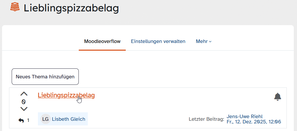 Öffne zunächst das Moodleoverflow in dem zugehörigen Kurs, aus dem du deinen Eintrag entfernen möchtest.
