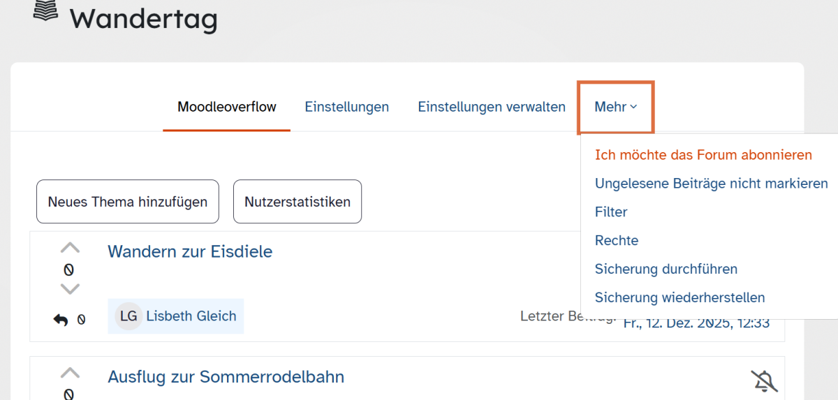 Sie möchten keine Frage und keine neue Antwort verpassen? Dann abonnieren Sie die Aktivität Moodleoverflow – so erhalten Sie Benachrichtigungen, sobald neue Beiträge oder Rückmeldungen in Ihrem Kurs entstehen. Hier zeigen wir Ihnen, wie das geht.