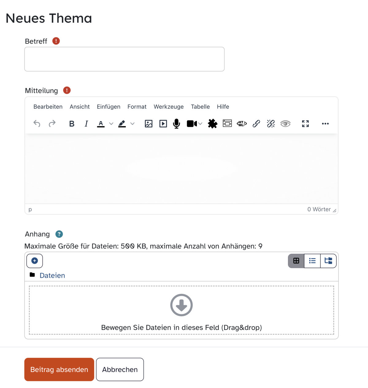 Im Feld Betreff formulierst du knapp dein Anliegen. Anschließend stellst du im Feld Mitteilung deine Frage. Wie in jedem Texteditor der Lernplattform kannst du deinen Beitrag gestalten, Medien einfügen oder z. B. ein Audio aufnehmen.
