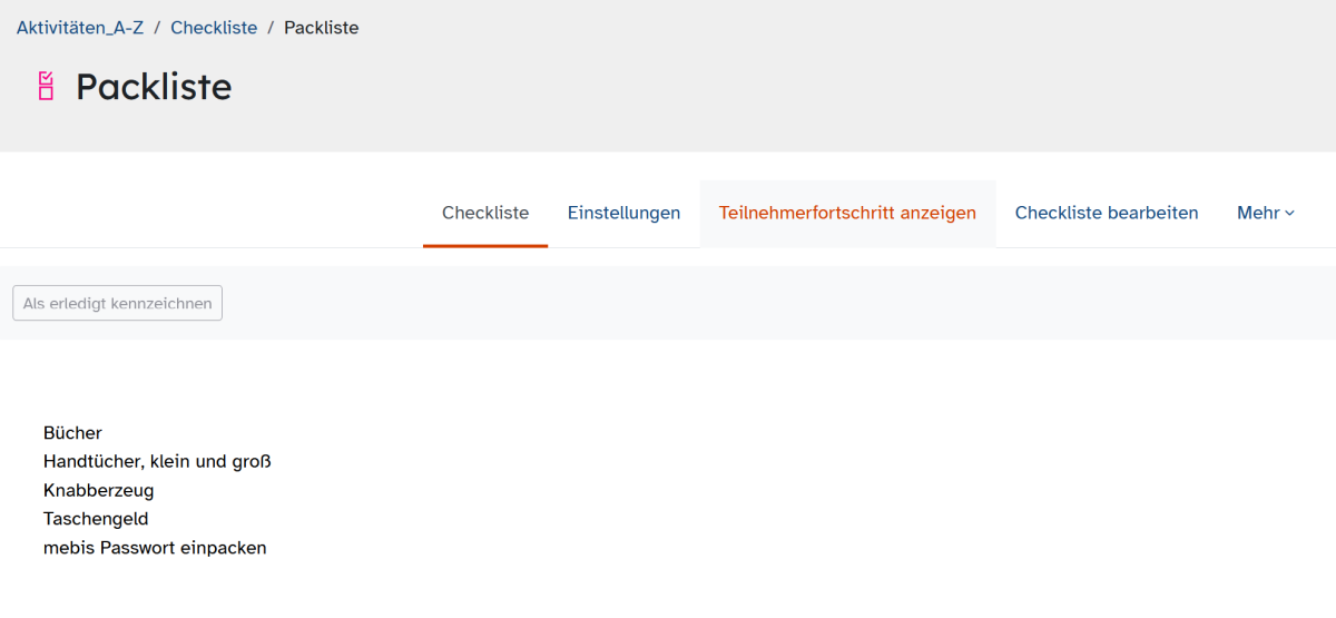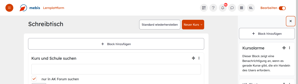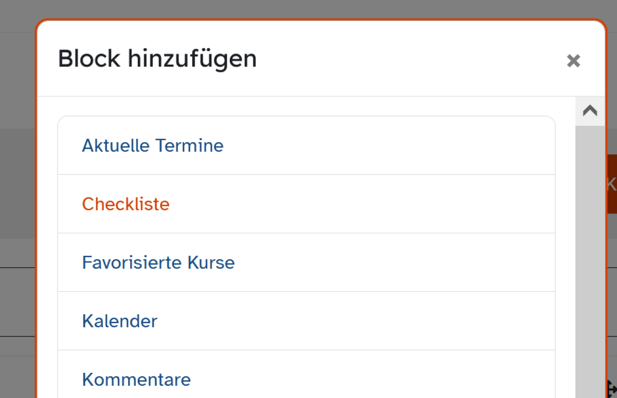 Fügen Sie in Ihrem Schreibtisch den Block Checkliste ein. Damit behalten Sie den Überblick über alle Checklisten Ihrer Kurse. Erfahren Sie hier, wie Sie dabei vorgehen!