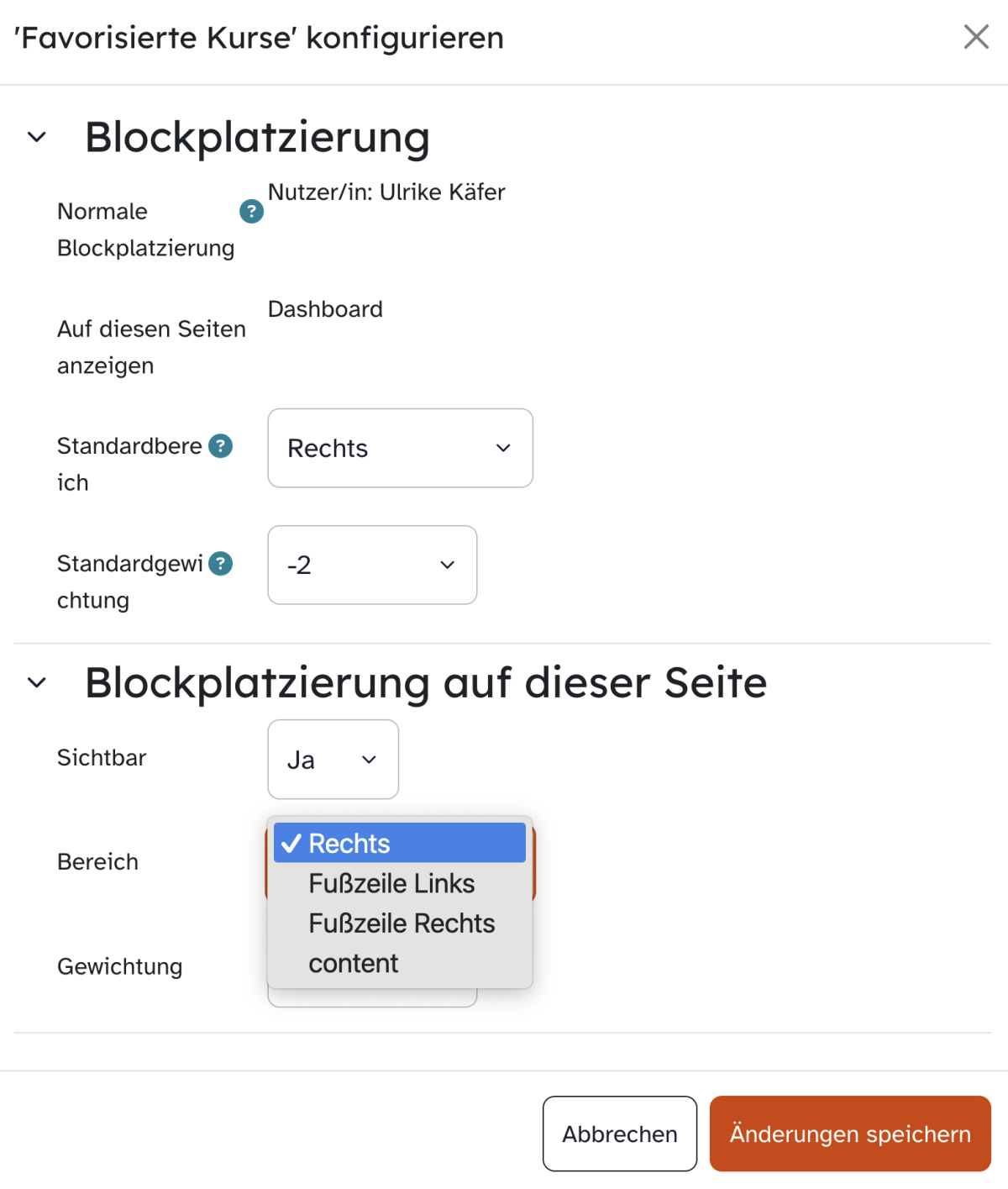Über das Pop-up-Menü unter Blockplatzierung auf dieser Seite schalten Sie den Block Sichtbar oder wählen den passenden Bereich, wie z. B. Fußzeile Links, aus. Schließen Sie den Vorgang mit Änderungen speichern ab.