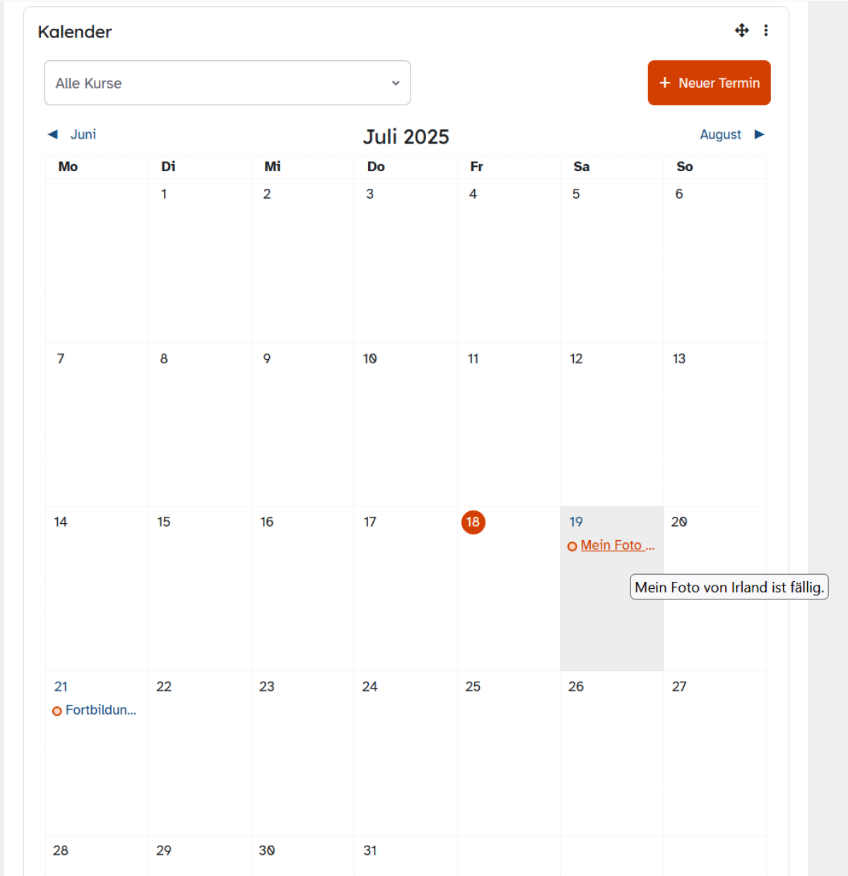 Aus all Ihren Kursräumen sehen Sie nun z.B. Aktivitäten mit Fälligkeit, persönliche Termine und Termine, die in einem Kurs in den Kalender des Kurses eingepflegt wurden. Damit erhalten Sie einen sehr guten Überblick über alle Termine rund um die Lernplattform.