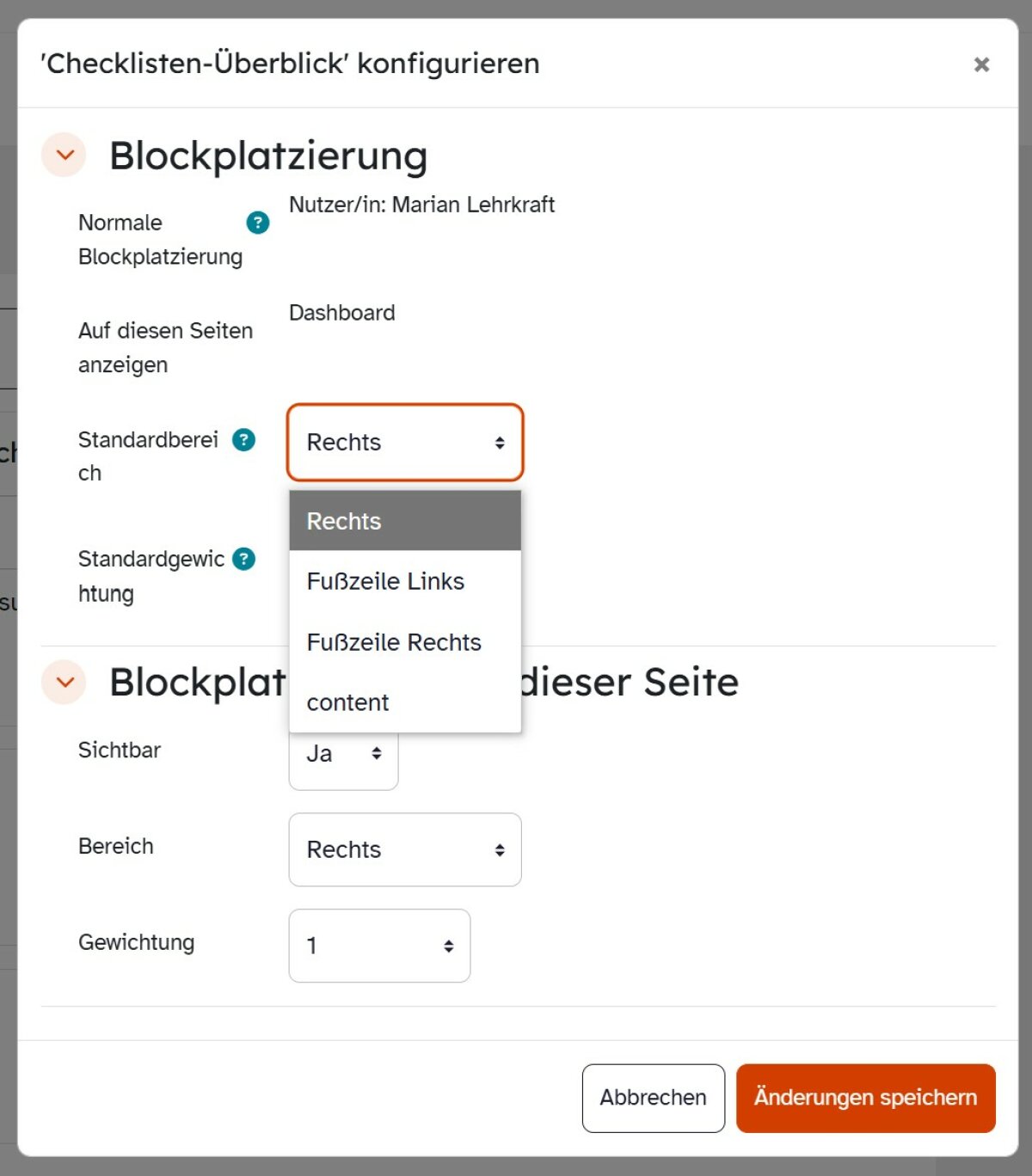 Unter Standardbereich stehen die Positionen Rechts (in der Blockleiste), Fußzeile rechts/links oder content zur Verfügung. content bedeutet hierbei, dass der Block mittig direkt auf dem Schreibtisch angezeigt wird.