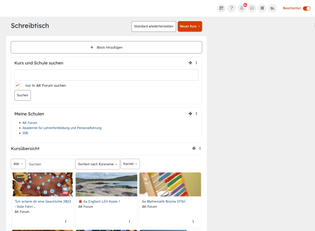 Im Drop-down-Menü Standardgewichtung wählen Sie auf einer Zahlenskala aus, wo in der vertikalen Reihenfolge der Block im Kurs dargestellt wird. Die Gewichtung erfolgt in Abhängigkeit der Gewichtungswerte der anderen Blocks. Der Block Kurs und Schule suchen hat z. B. die Gewichtung - 1. Blöcke mit geringerem Wert (z. B. - 2) erscheinen oberhalb der Suchzeile, Blöcke mit höherem Wert unter der Suchzeile.