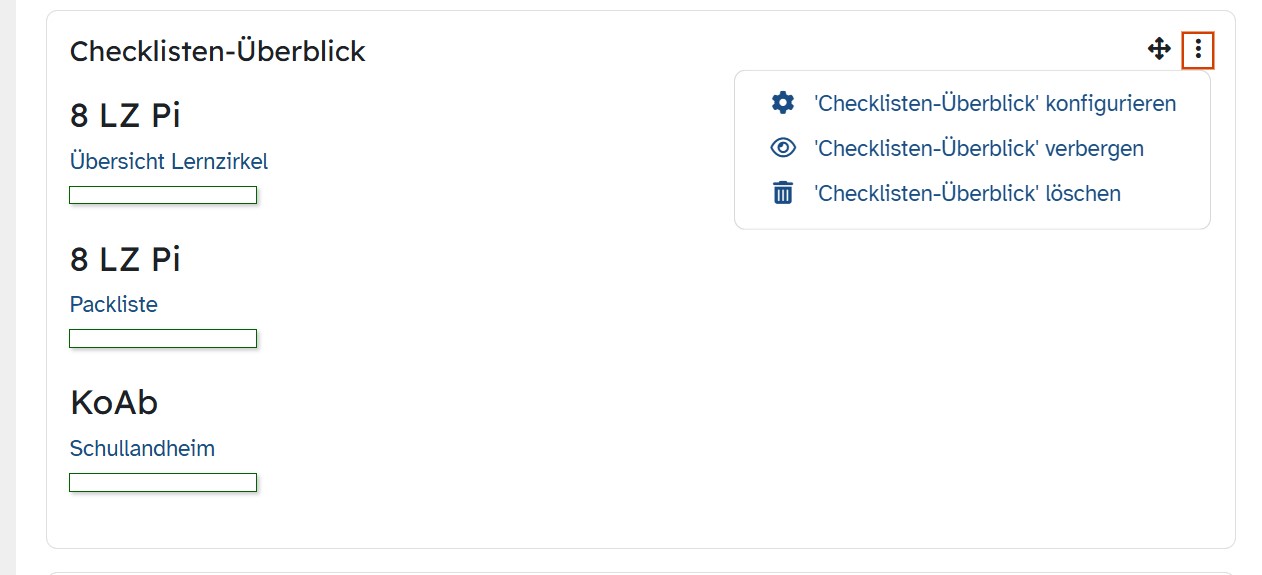 Mit einem Klick auf das Auge-Symbol wird der Inhalt des Blocks zur besseren Übersicht eingeklappt - es ist nur die Überschrift (z. B. Checklisten-Überblick) sichtbar, bis der Block wieder sichtbar gemacht wird.