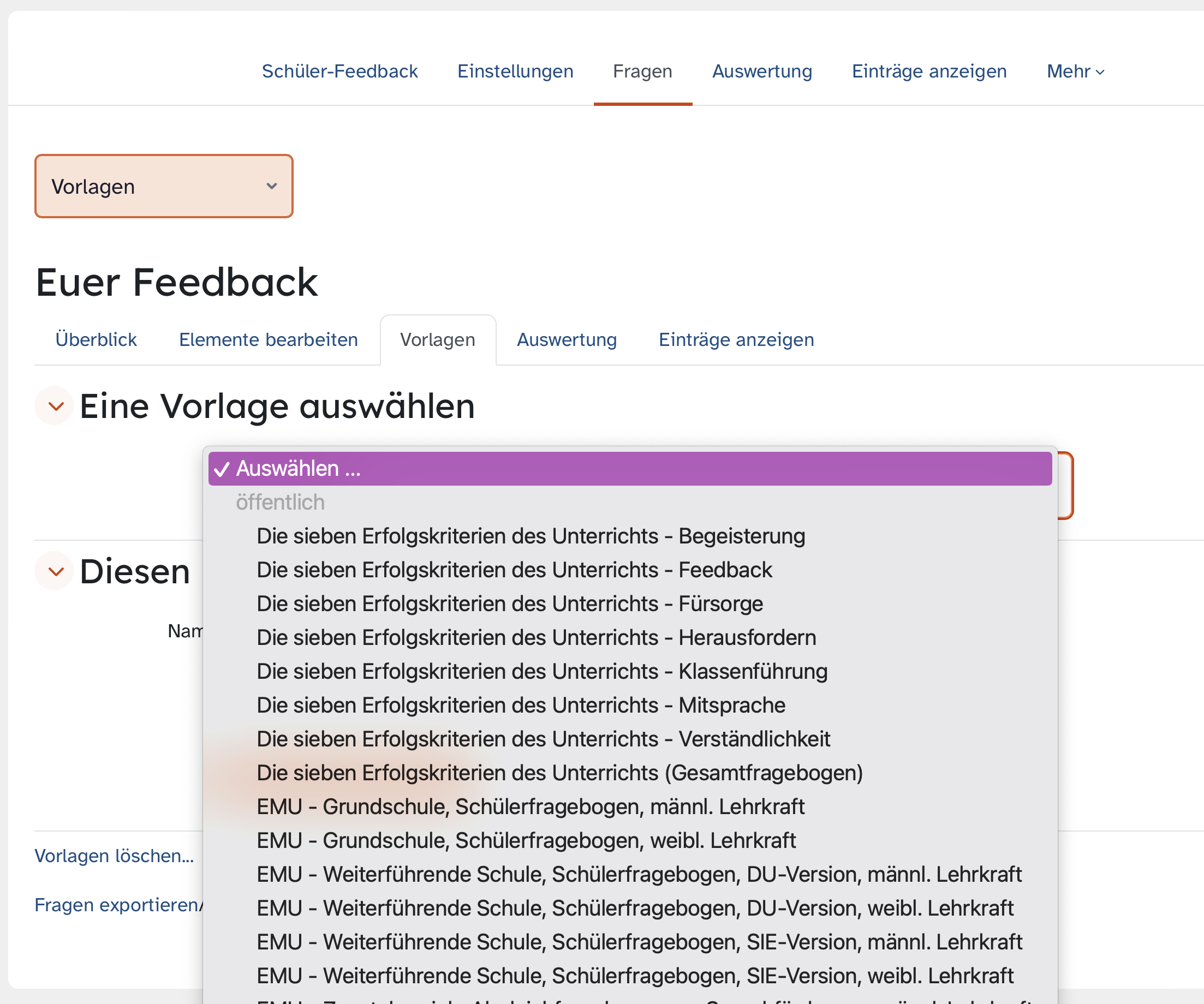 Klicken Sie in der sekundären Navigationsleiste auf Vorlagen. Im Drop-down-Menü Eine Vorlage auswählen klicken Sie auf Auswählen. Es öffnet sich eine Liste der zur Verfügung stehenden Vorlagen. Wählen Sie eine davon aus und klicken Sie sie zur Ansicht an. Gehen Sie die einzelnen Fragen durch und entscheiden Sie bei jeder Frage, ob Sie diese übernehmen wollen. Durch einen Klick auf das Häkchen wird die Auswahl entfernt und die Frage erscheint nicht in Ihrer eigenen Aktivität.